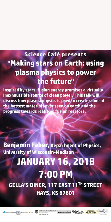 This talk will discuss how plasma physics is used to create some of the hottest materials ever seen on earth and the progress towards realizing fusion reactors. Presenter is Hays native Benjamin Faber, Department of Physics, University of Wisconsin-Madison.