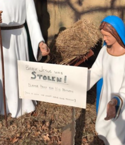 A sign staked outside the nativity read: “Baby Jesus was STOLEN! Please pray for his return.” The church said it “can’t have nice things” in smaller letters. Over the years, other statues have gone missing, including a camel.