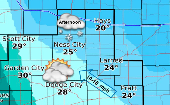 Today A slight chance of snow between 2pm and 5pm. Mostly cloudy, with a high near 20. Wind chill values as low as -4. North wind 5 to 10 mph becoming east southeast in the morning. Chance of precipitation is 20%.