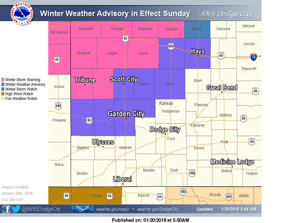 The National Weather Service in Dodge City has issued a Winter Weather Advisory for snow and blowing snow, which is in effect from 6 AM CST /5 AM MST/ Sunday to 6 AM CST /5 AM MST/ Monday.