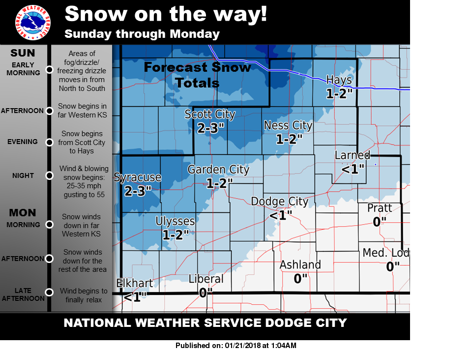 Snow is likely Sunday night through Monday. One of the biggest impacts may be blowing snow beginning late Sunday night through Monday (especially Monday morning) with wind speeds of 25-35 mph, gusting to 55. Make sure you stay weather aware.