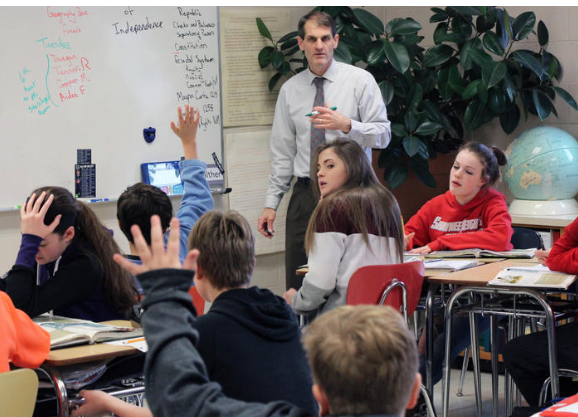 Charles Walther teaches a Kansas history lesson at Shawnee Heights Middle School on Tuesday. Walther hopes a case pending before the Kansas Supreme Court could bring back tenure for some teachers.