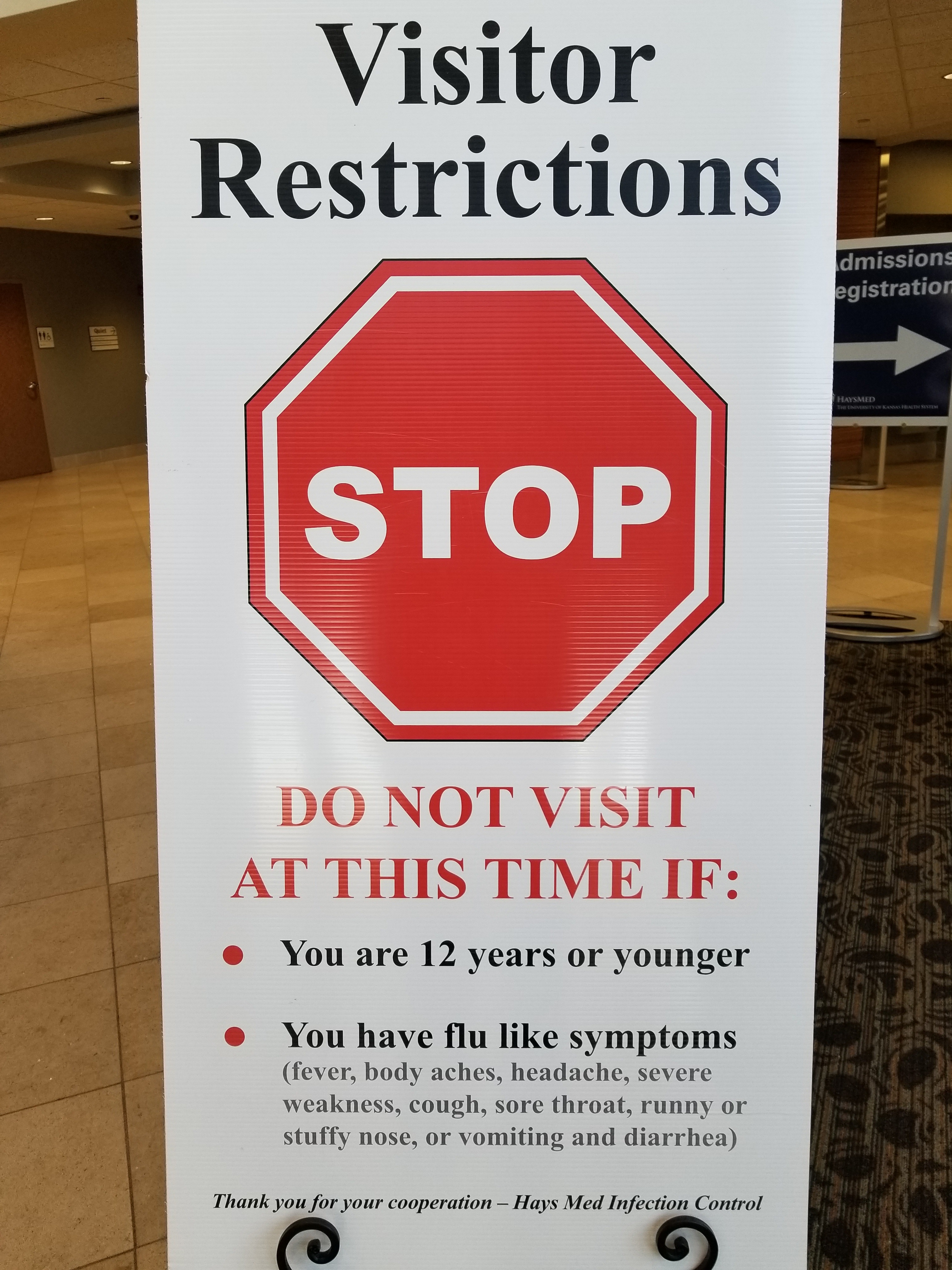 Effective Wednesday, visitors at HaysMed will be restricted due to an increase in influenza and other respiratory illnesses. Visitors who have symptoms of Influenza (fever, body aches, headache, severe weakness, cough, sore throat, runny or stuffy nose) or are 12 years of age or younger will not be allowed on patient floors.