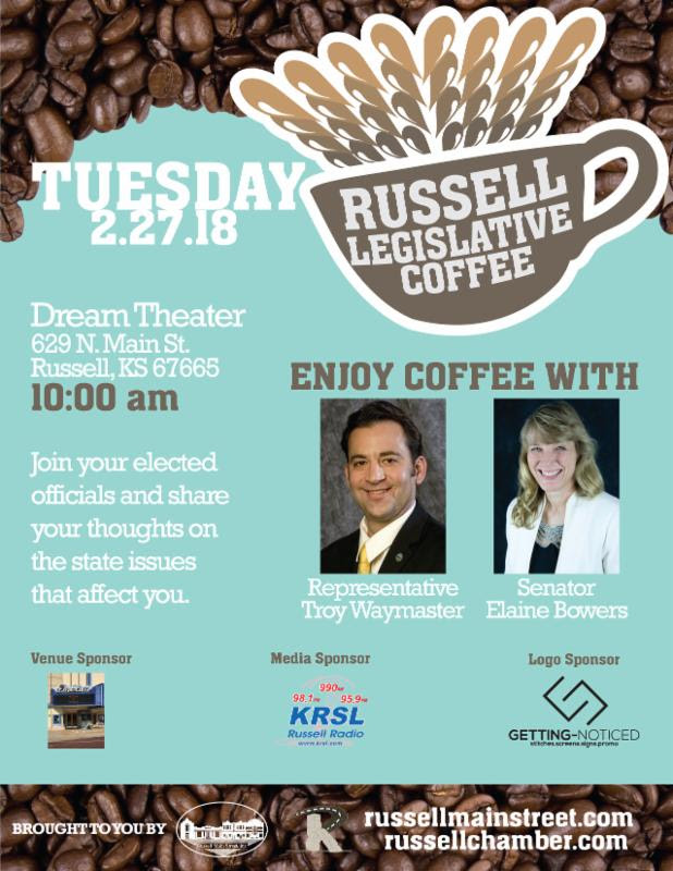 RUSSELL – A legislative coffee will be held Tue., Feb. 27 at 10 a.m. in Russell at the Dream Theater, 629 N. Main.