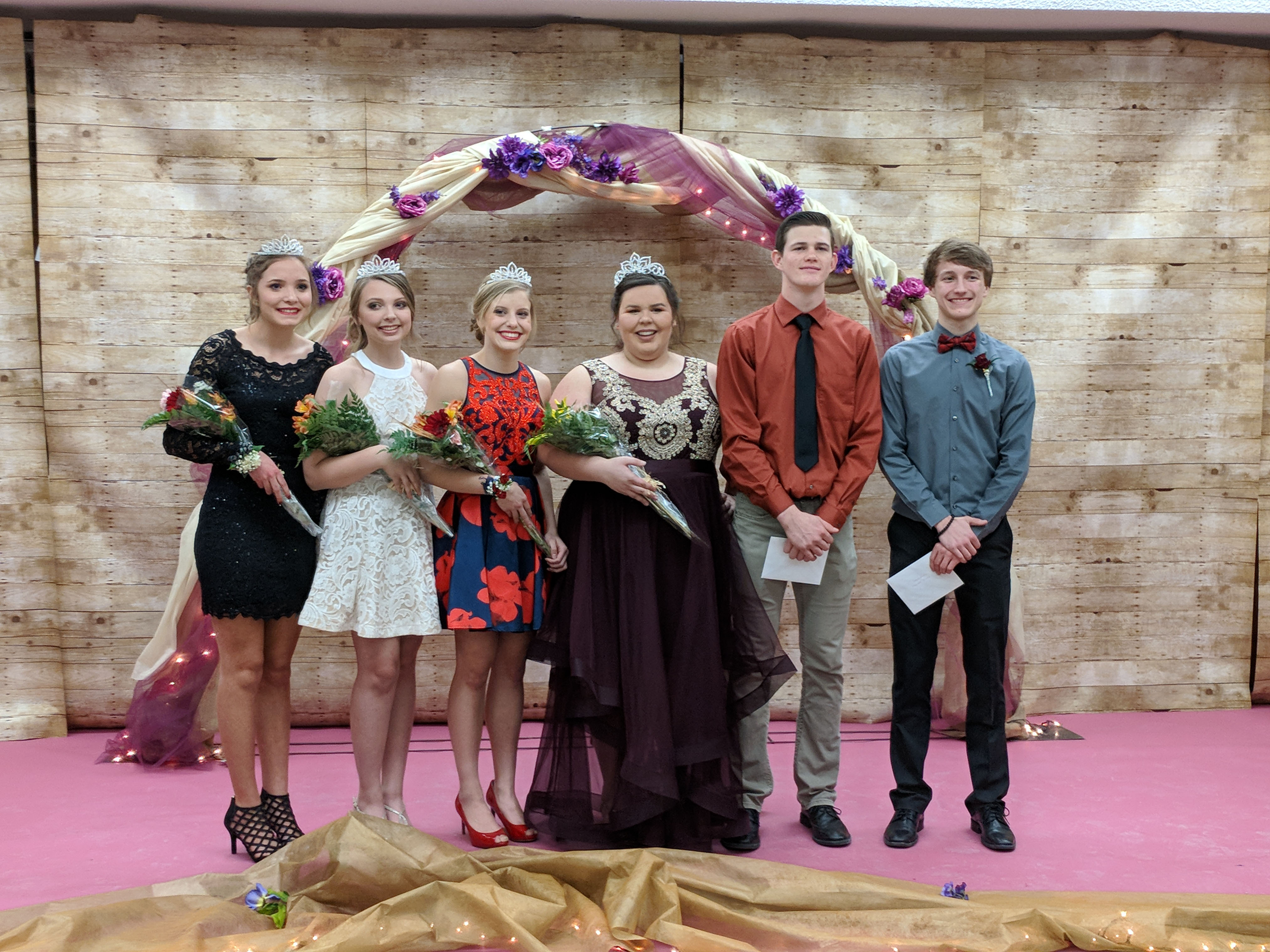 Freshman Queen, Maggie James, daughter of Wesley James and Alice James; Sophomore Queen, Lauryn Becker, daughter of Chris and Brandy Becker; Junior Queen, Cassie Waldschmidt, daughter of Pete and Sandy Waldschmidt; Senior Queen, Aiden Johnson, daughter of Kip Johnson and the late Celeste Johnson; Senior King, Geoffrey Soneson, son of Rob and Donna Soneson; and Freshman King, Brady Frickey, son of Stacy and Brad Frickey.