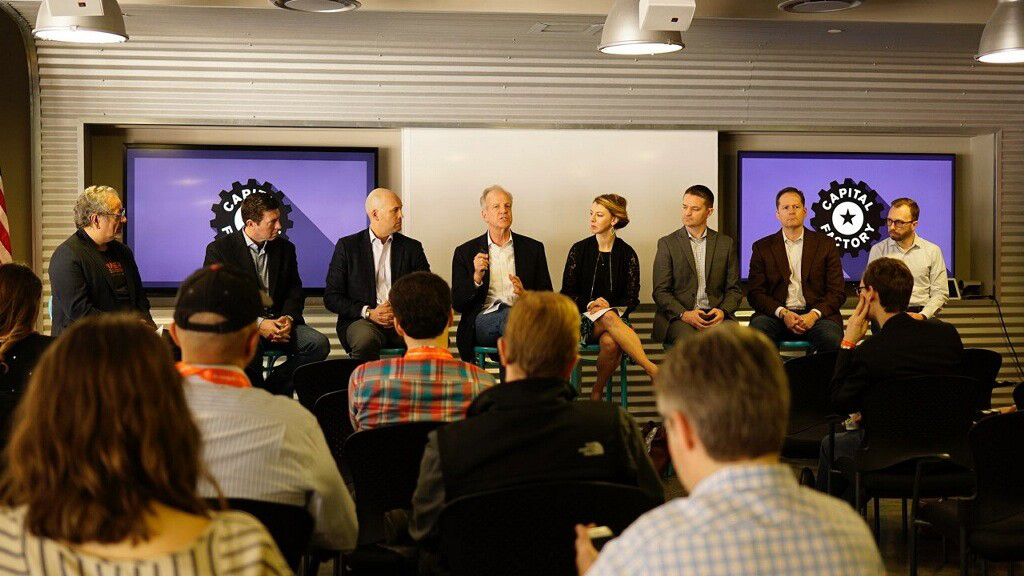 Sen. Moran speaking at a Capital Factory panel entitled, “Supporting Startups to Fuel American Competitiveness.” From left to right, moderator Eugene Sepulveda of Capital Factory, panelists Kansan Jason Tatge with Farmobile, Jeff Farrah with the National Venture Capital Association, Sen. Moran (R-Kan.), Rachel Wolbers with Engine, Ben Johnson with the State Science & Technology Institute, John Dearie with the Center for American Entrepreneurship and Kansan Jason Wiens with the Kauffman Foundation.