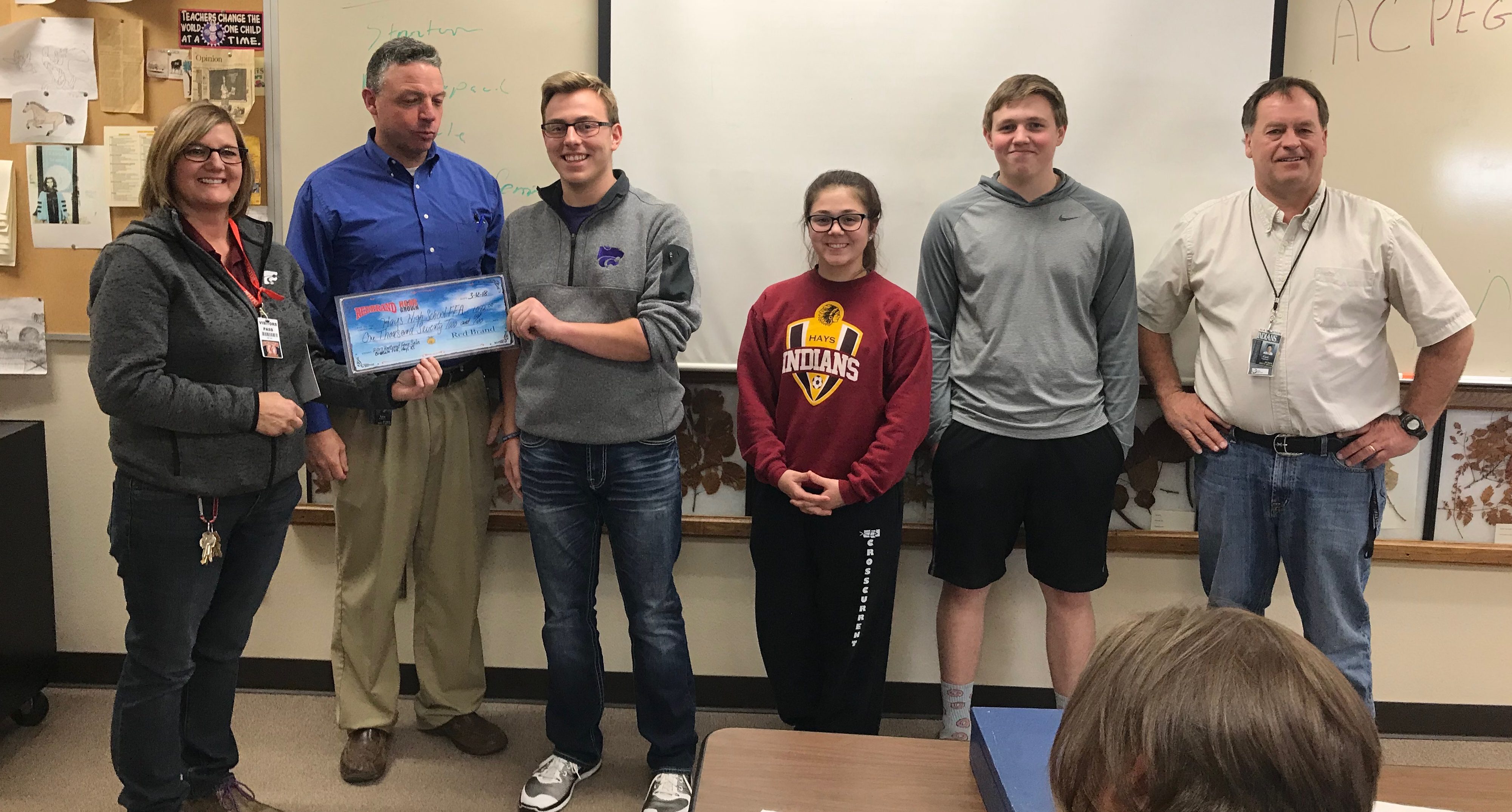 Wittman (far left) presents check to HHS FFA officers and Curt Vajnar (far right)