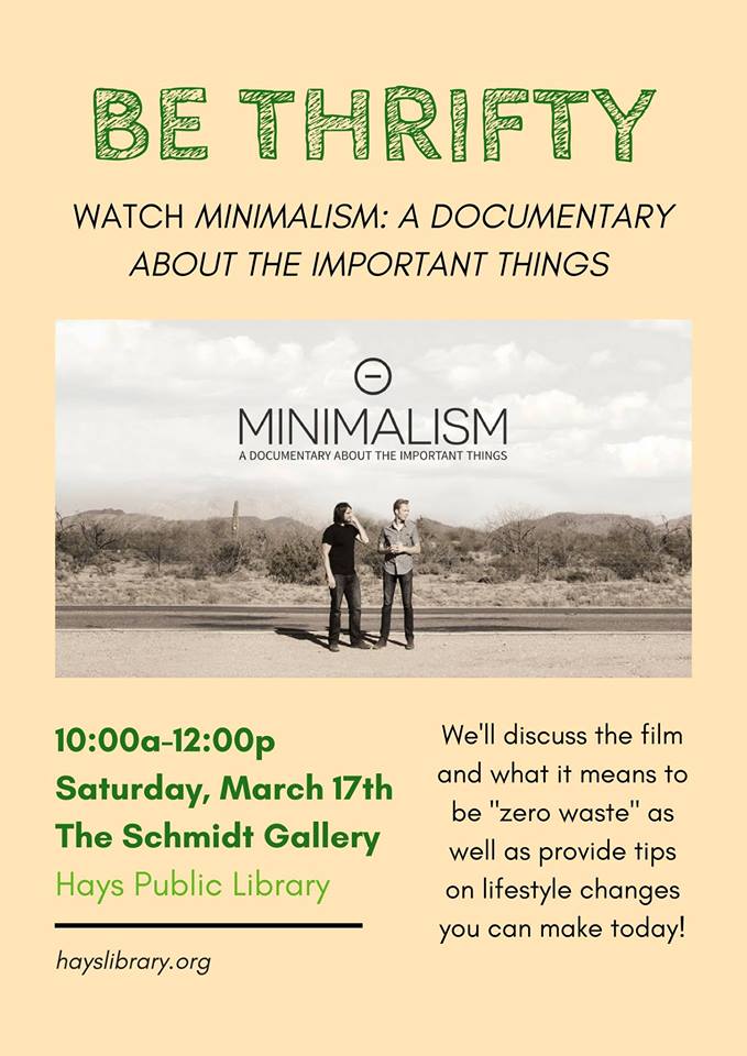 Join the Hays Public Library to watch “Minimalism: A Documentary About the Important Things”, followed by a discussion.This event will be the first in a series, so stay tuned!
