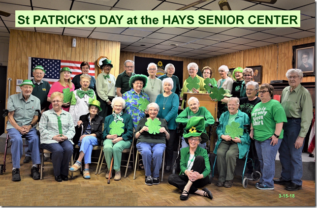 Although most of the guests are of Volga-German descent, patrons at the March 15 lunch at the Hays Senior Center celebrated an early St. Patrick’s Day while wearing the traditional green.