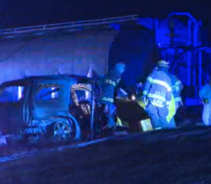 It hit the barrier wall. A semi driven by Andrew Rutenbeck, 30, Clinton, IA., struck the Yukon as it re-entered the roadway caught fire and burned.