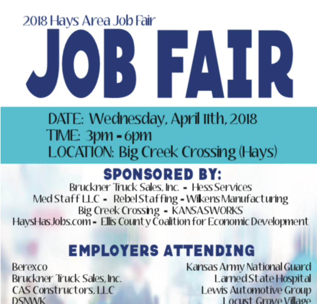The Ellis County Coalition for Economic Development will host the annual Hays Area Job Fair at Big Creek Crossing on April 11 from 3 to 6 p.m. The job fair has been in place since 2011.