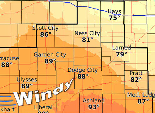 Strong winds will return to western Kansas today and continue through early tonight. Sustained winds of 30 to 40 mph will be possible late this afternoon and early tonight. Wind gusts as high as 55 to 60 mph will also be possible. #kswx pic.twitter.com/03OGG8SFxW