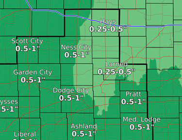 The latest forecast calls for around a half inch or more of rainfall over much of the SW KS region late today through Sat. evening #kswx pic.twitter.com/0A22rOXCMj