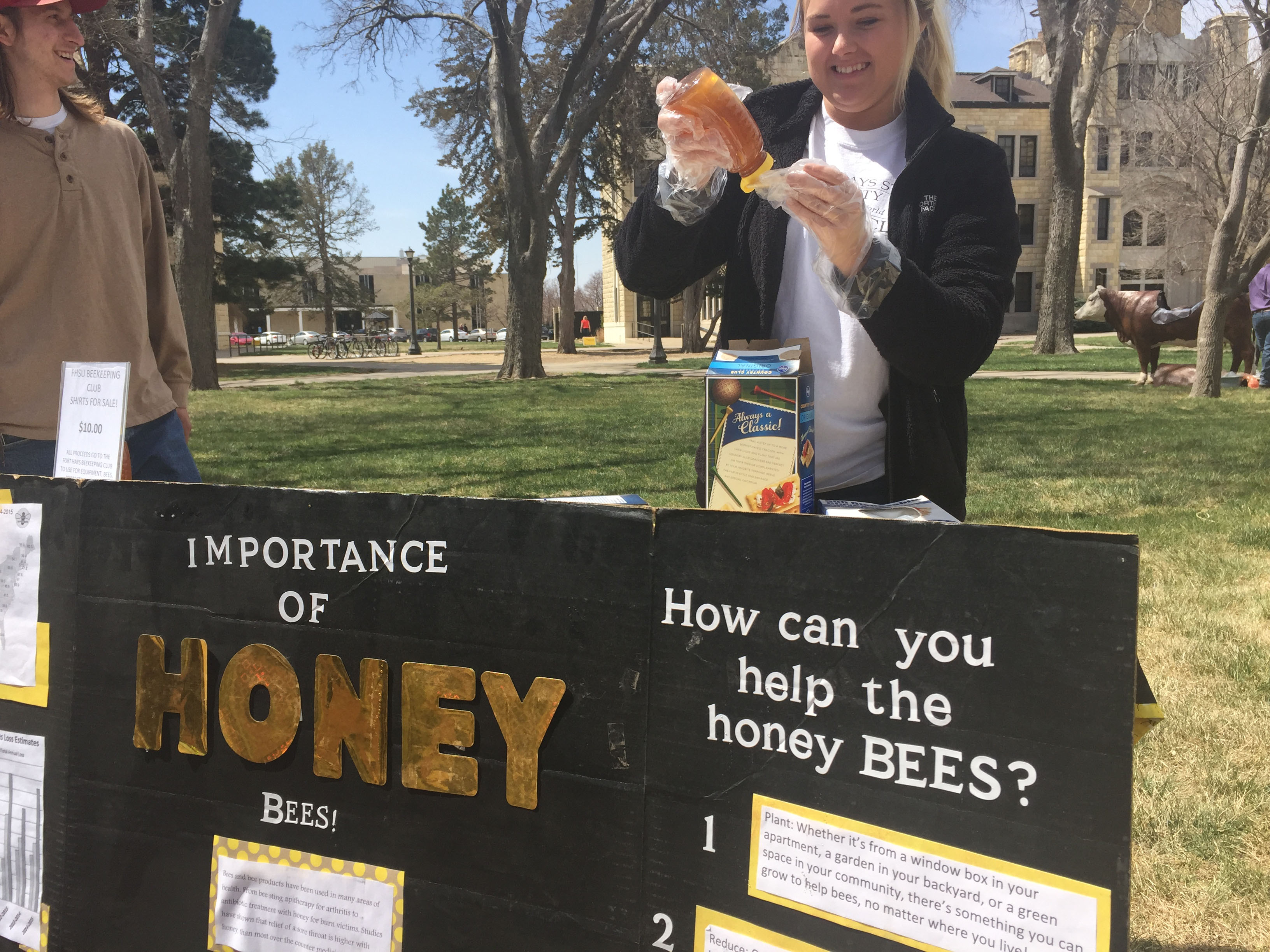 Bees are vital to crop pollination. FHSU Bee Club Ryan Engel and Elissa Jensen explained why as they gave out samples of the lightly colored, lightly sweet honey harvested from the university’s two bee hives.