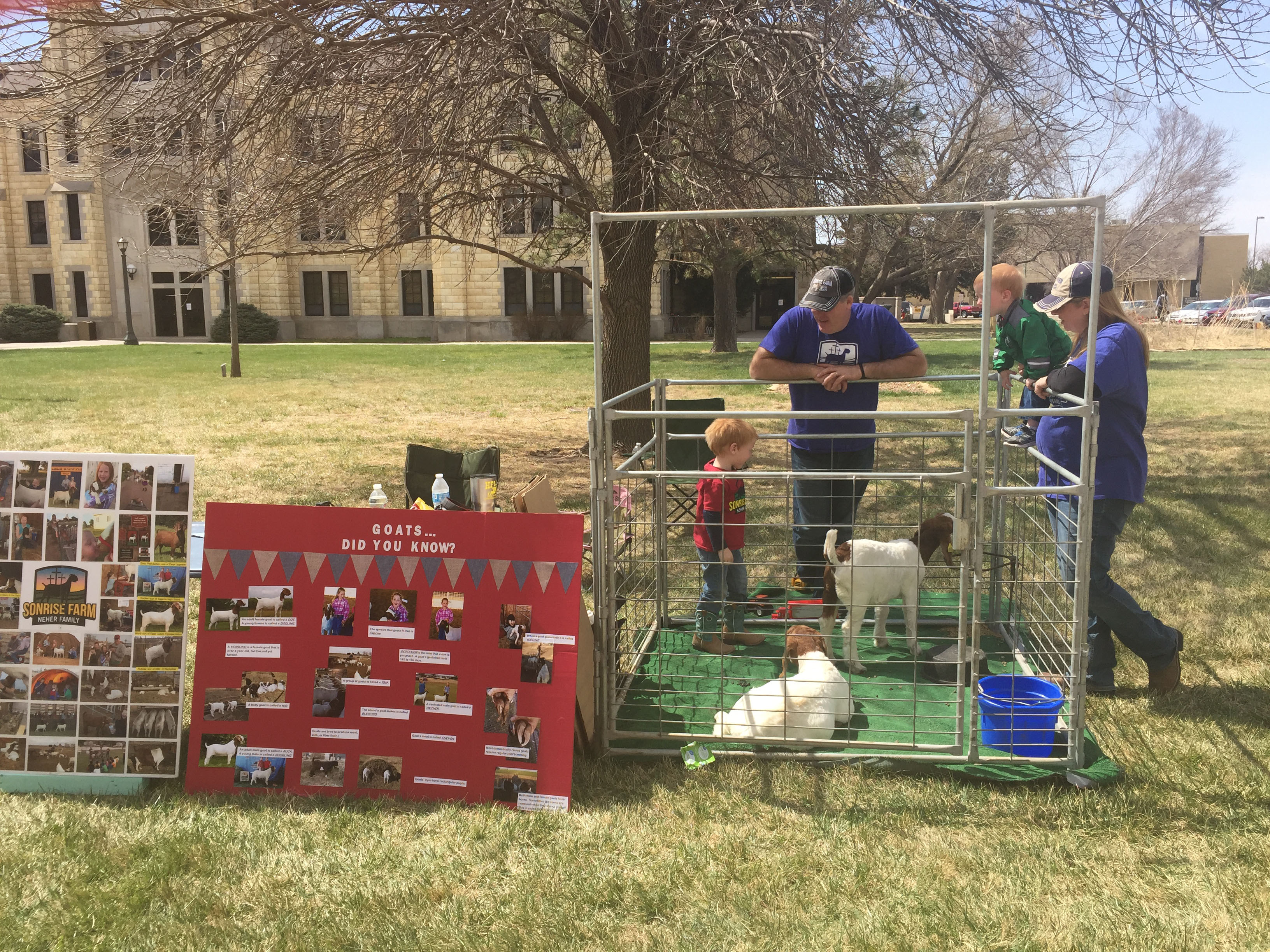 The Sonrise Farm, operated by the Neher family of Pfeifer, had two of their Boer meat goats in a pen on the green grass. People were invited to lean down and pet the goats but cautioned about the goats’ propensity to nibble on loose clothing.