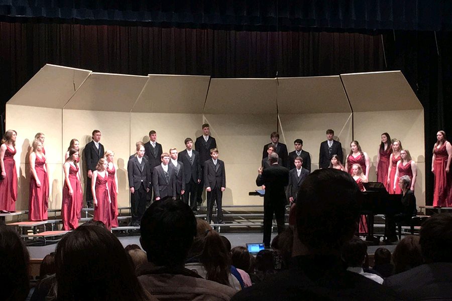 Chamber Singers performed two pieces at state Large Group. Normally choirs are required to perform three and have four prepared, however since Instructor Johnny Matlock took two choirs he was allowed to have one group only perform two pieces. The group performed “Even When He Is Silent” by Kim André Arnesen and “Clocks,” the fourth movement of a set of music called “Time Pieces” by Stephen Chatman. (Photo by Isabelle Braun)