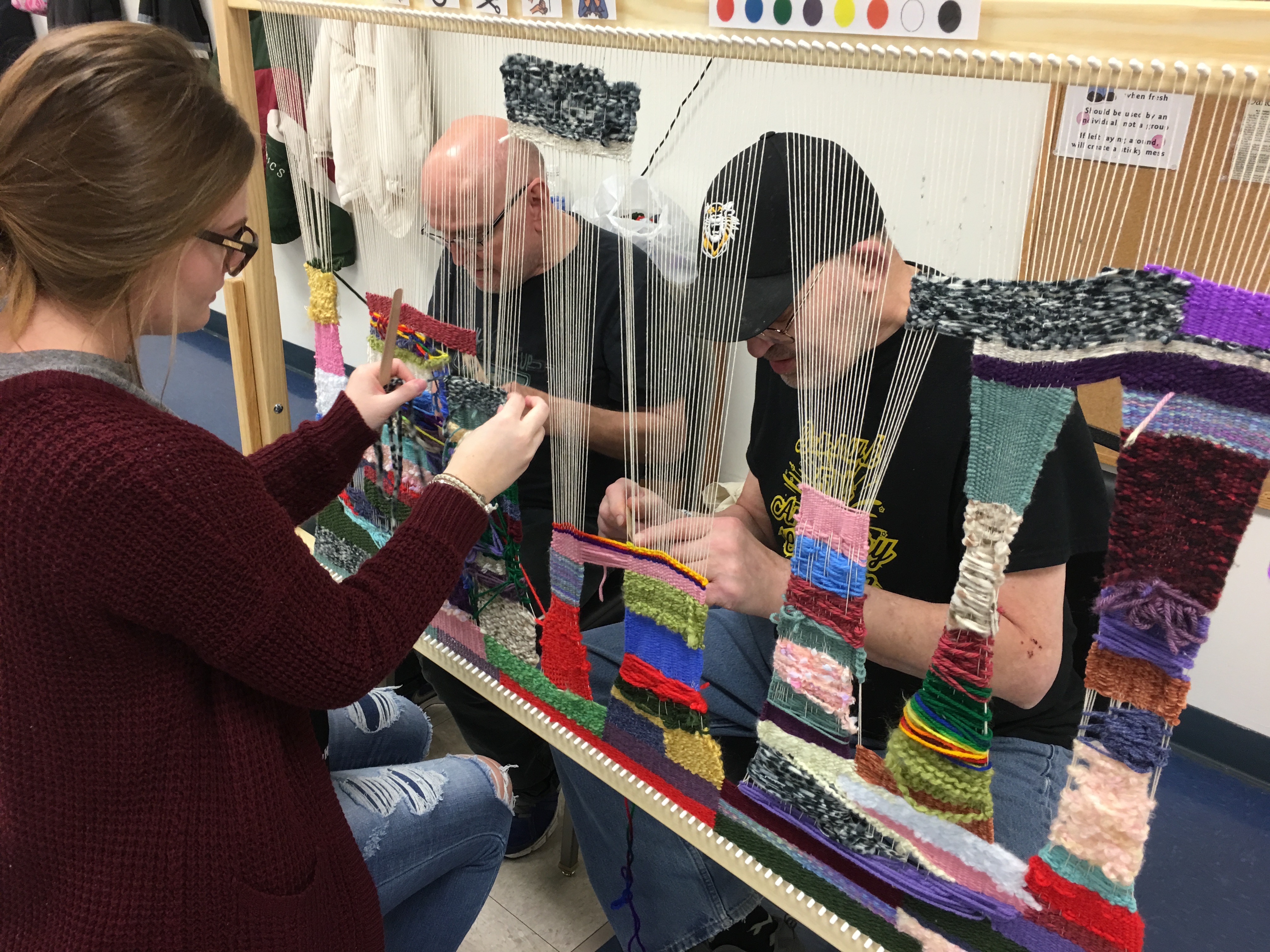 FHSU students visited the Reed Center twice a week and worked with clients. About four clients at a time worked with the FHSU students on large looms to create multi-colored and -textured wall hangings.