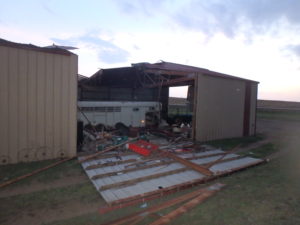 A large section of a roof and the side of a Morton building were casualties of last night’s storm. The building is owned by Ricky and Rebecca Bremerman. Their home only received minor damage.
