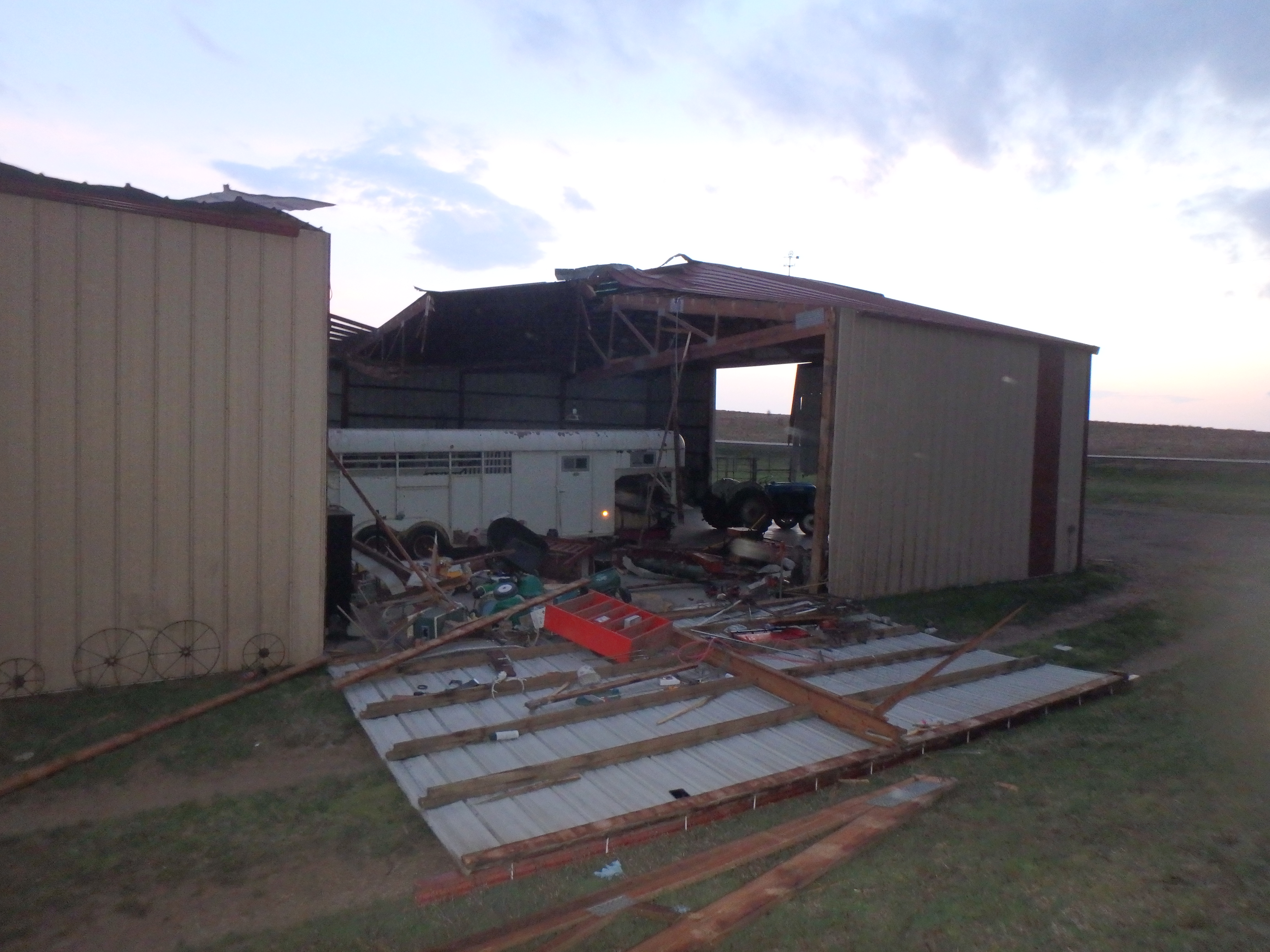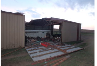 A large section of a roof and the side of a Morton building were casualties of last night’s storm. The building is owned by Ricky and Rebecca Bremerman. Their home only received minor damage.