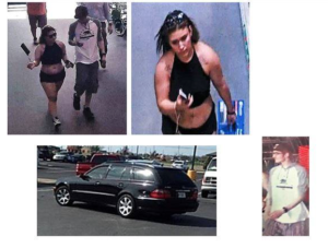 The second suspect is identified as a white female in her 20’s, 5-foot-5, 175 pounds, wearing a black sports bra type top and black shorts.