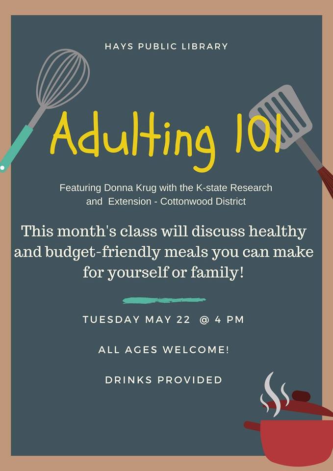 Donna Krug from K-State Research and Extension – Cottonwood Extension District will be joining the Hays Public Library for this month’s Adulting 101 class to discuss healthy and budget-friendly meals that you can make for yourself or your family!