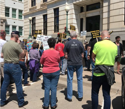About 40 protesters with the Poor People’s Campaign gathered outside the building housing Kobach’s office to decry his stance against illegal immigration and for tough voter identification laws. The protesters called those policies tools of white supremacy.