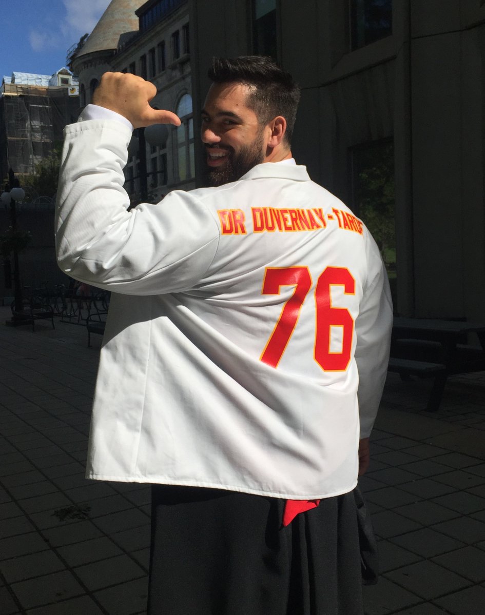 Duvernay-Tardif posted a photo of himself on social media after commencement wearing a lab coat with “Dr. Duvernay-Tardif” across the back and his No. 76 in Chiefs colors. “This is it!” he said. “Today I become a doctor! It also marks the beginning of a great new adventure.”