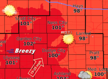 Today Sunny, with a high near 98. Breezy, with a south southeast wind 7 to 12 mph increasing to 18 to 23 mph in the afternoon.