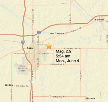 SALINE COUNTY — An earthquake shook central Kansas Monday. The quake at 5:54 a.m. measured a magnitude 2.9 and was centered approximately 4 miles east of Salina, according to the U.S. Geological Survey.