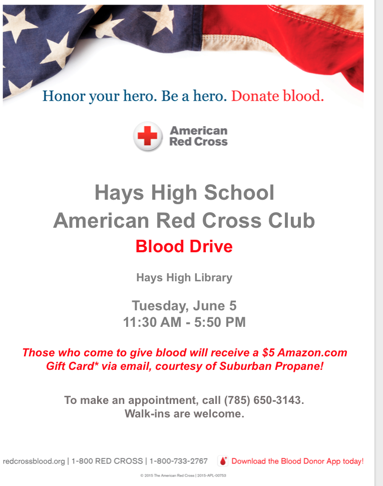 The American Red Cross and the Hays High School American Red Cross Club is conducting a blood drive until 5:50 p.m. Tuesday at Hays High library.