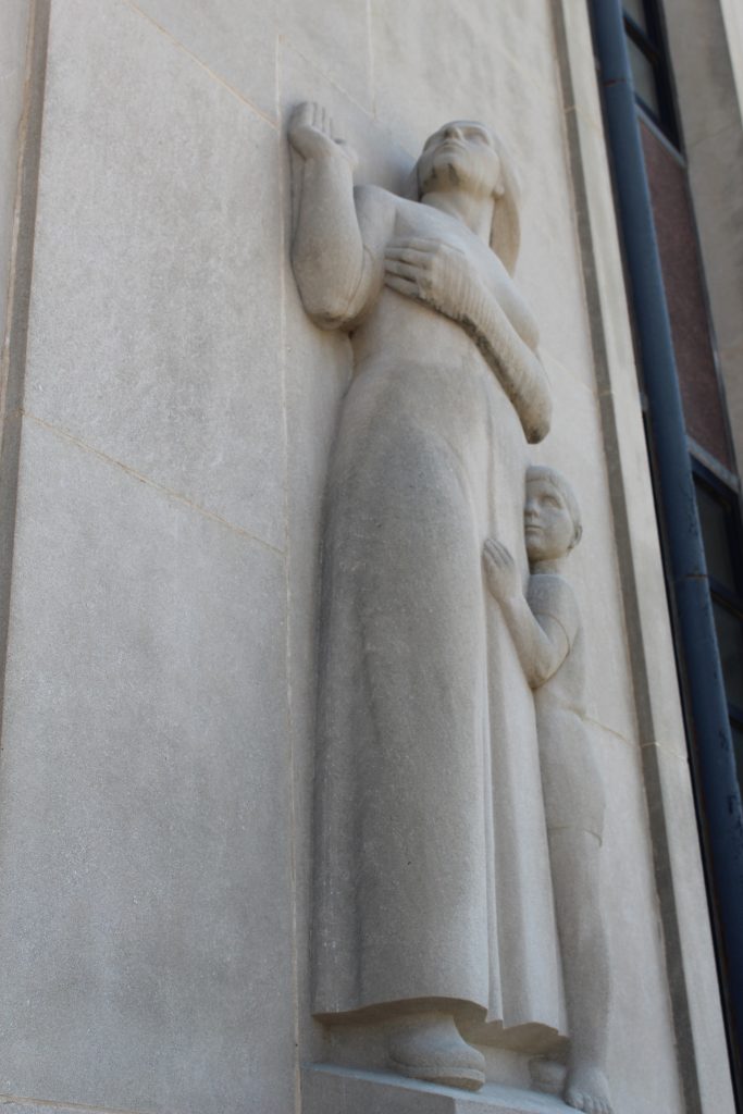 If you are at the Cozy, turn around, because down the street is a beautiful relief sculpture on Sacred Heart Cathedral. The church was built between 1951 and 1953 and combines Greek styles with something that is reminiscent of a Kansas grain silo. The limestone sculpture depicts Christ on the Cross with a turned head looking down upon a processional lead by a Kansas farmer and his family.