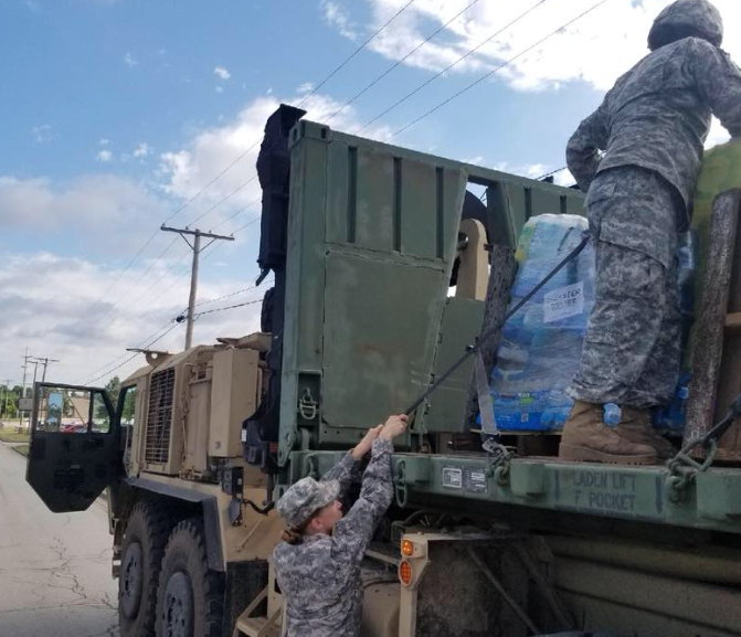 The Kansas Division of Emergency Management requested Kansas National Guard resources to transport 26 pallets of bottled water to Norton.