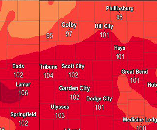 Highs today will range from 100 to 103. Stay safe in the heat! Drink plenty of water. Work outdoors early or very late in the day. #kswx pic.twitter.com/UvkdElB0IH