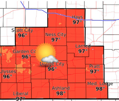 Today Mostly sunny, with a high near 98. Breezy, with a south wind 11 to 16 mph increasing to 17 to 22 mph in the afternoon.