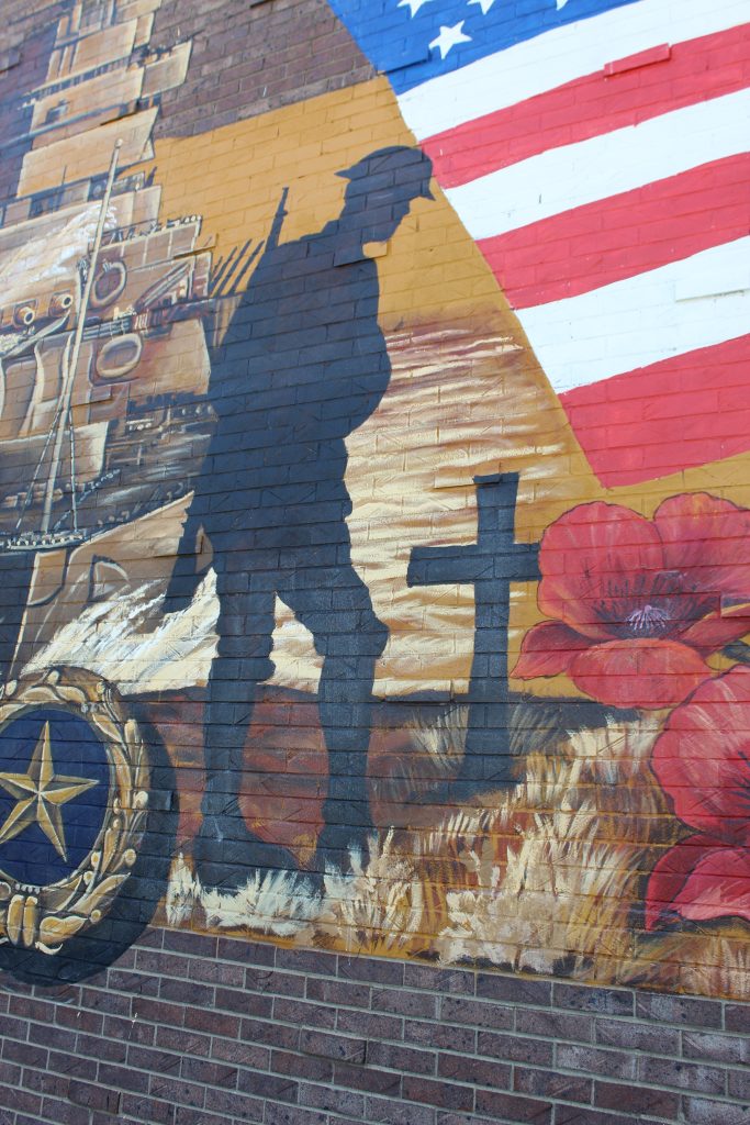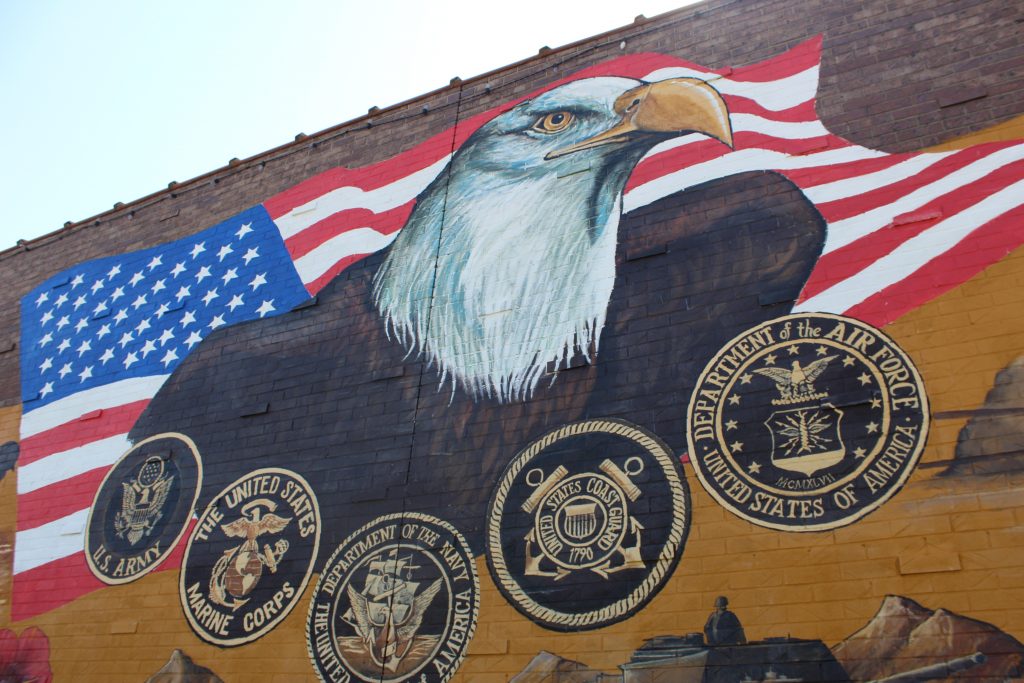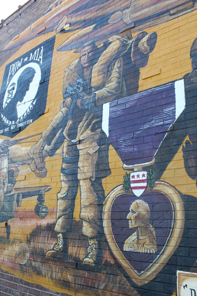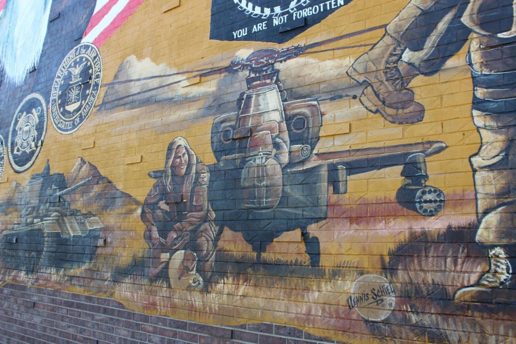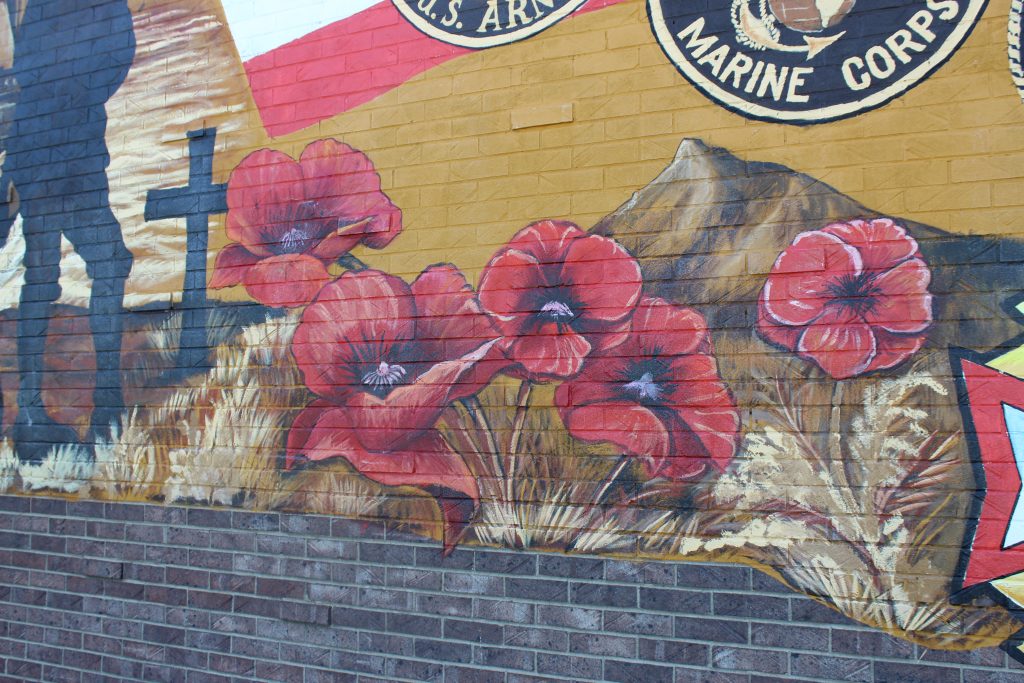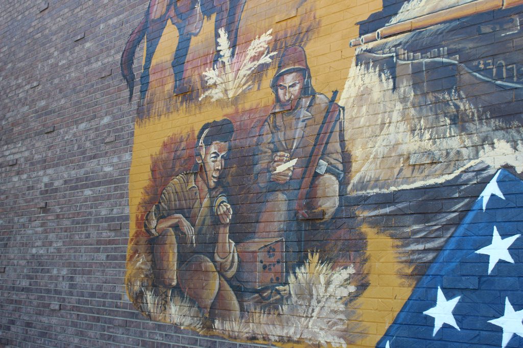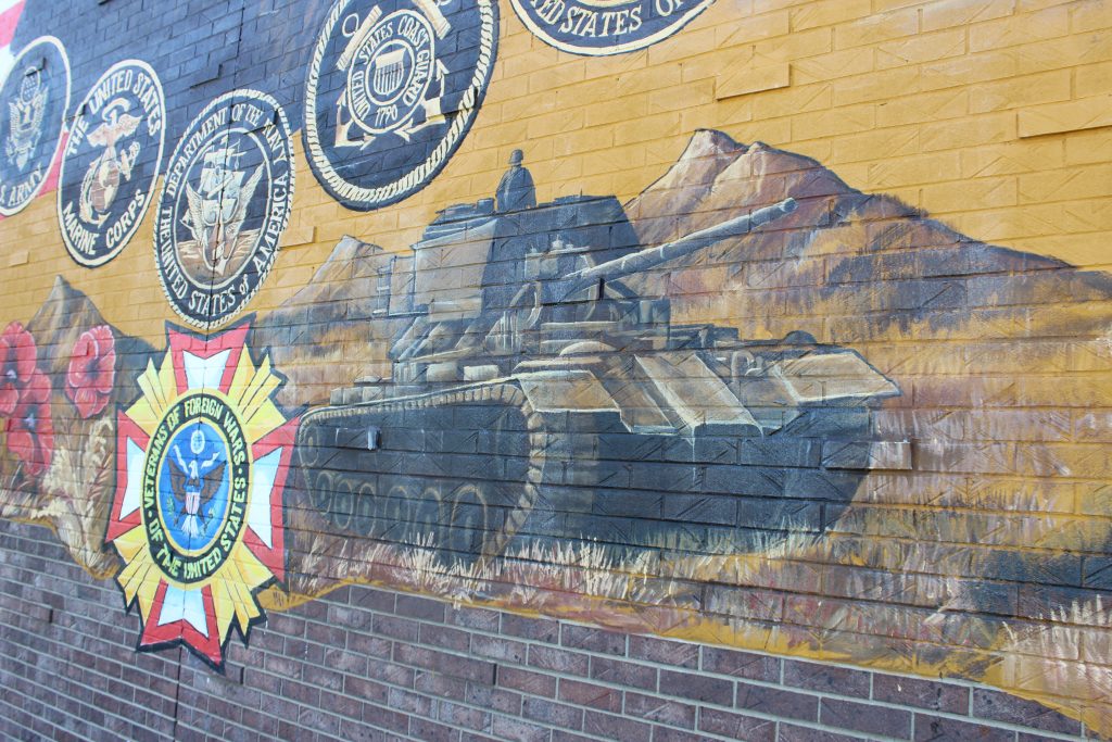 The mural is painted in earth tones similar to the FOX mural with the exception of the American flag, bald eagle, poppies, VFW logo and a Purple Heart. It depicts a timeline of U.S. military history as well as U.S. military symbols. A kiosk will eventually be added to the mural to explain the images in the mural, including the Buddy Poppies, buffalo solider, code talker and military nurse.