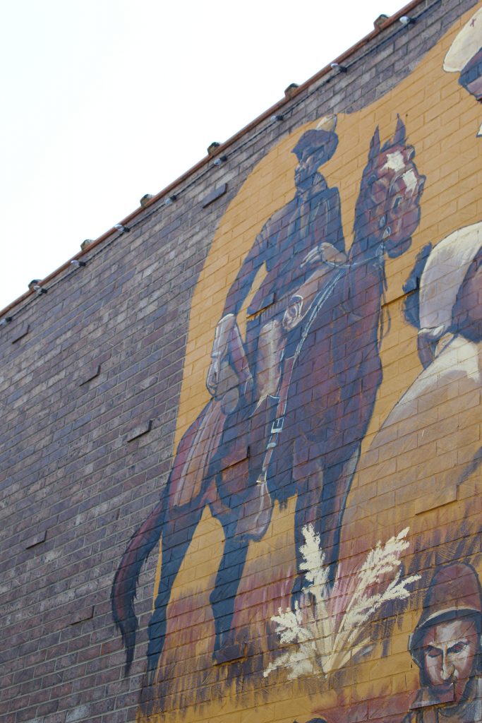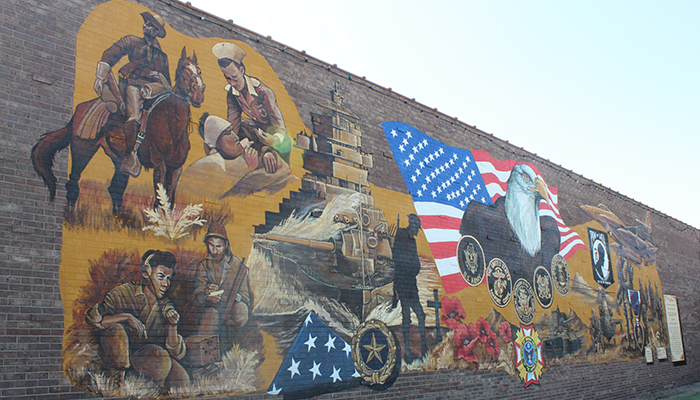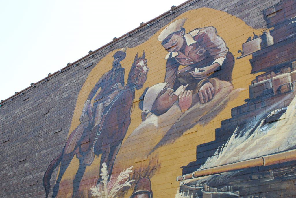 The mural depicts armed forces personnel from a buffalo soldier to the present.