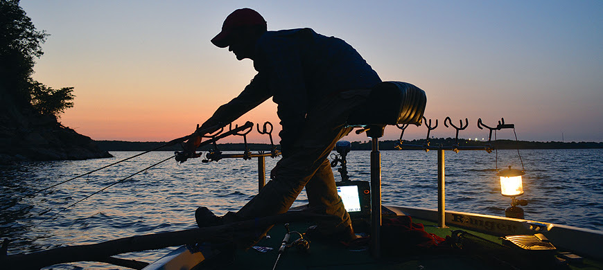 It may take a trip or two to become accustomed to fishing at night, and there are safety considerations to keep in mind. Once the sun sets, your boat needs to have navigation lights on. Motor boats less than 40 feet long should have a white light at the stern, visible all around, and a light at the bow, showing red on the port side and green on the starboard side. A white light should be visible when the boat is at anchor. Wear your lifejacket and become familiar with the area before it gets dark. Go slow and use a hand-held spotlight to locate shorelines or obstacles while under power. If your sonar has GPS, use the map page with the trackback function on so you’ll have a safe route back to the ramp in the dark.