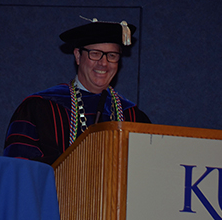 Meagan Patterson, president of KU’s Phi Beta Kappa chapter and professor of educational psychology, presided at the May 13 ceremony immediately before university commencement. David Slusky, vice president of the chapter and professor of economics, welcomed and congratulated the new initiates as they received their Phi Beta Kappa certificates.