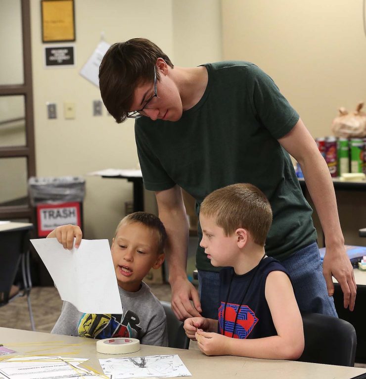 Ann Noble, financial administrator for SMEI, said her granddaughter looks forward to coming to the camp from Olathe each summer. This year, 8-year-old Laney Velleca brought along her younger brother, 7-year-old Cooper, to the “Building with Math” camp.