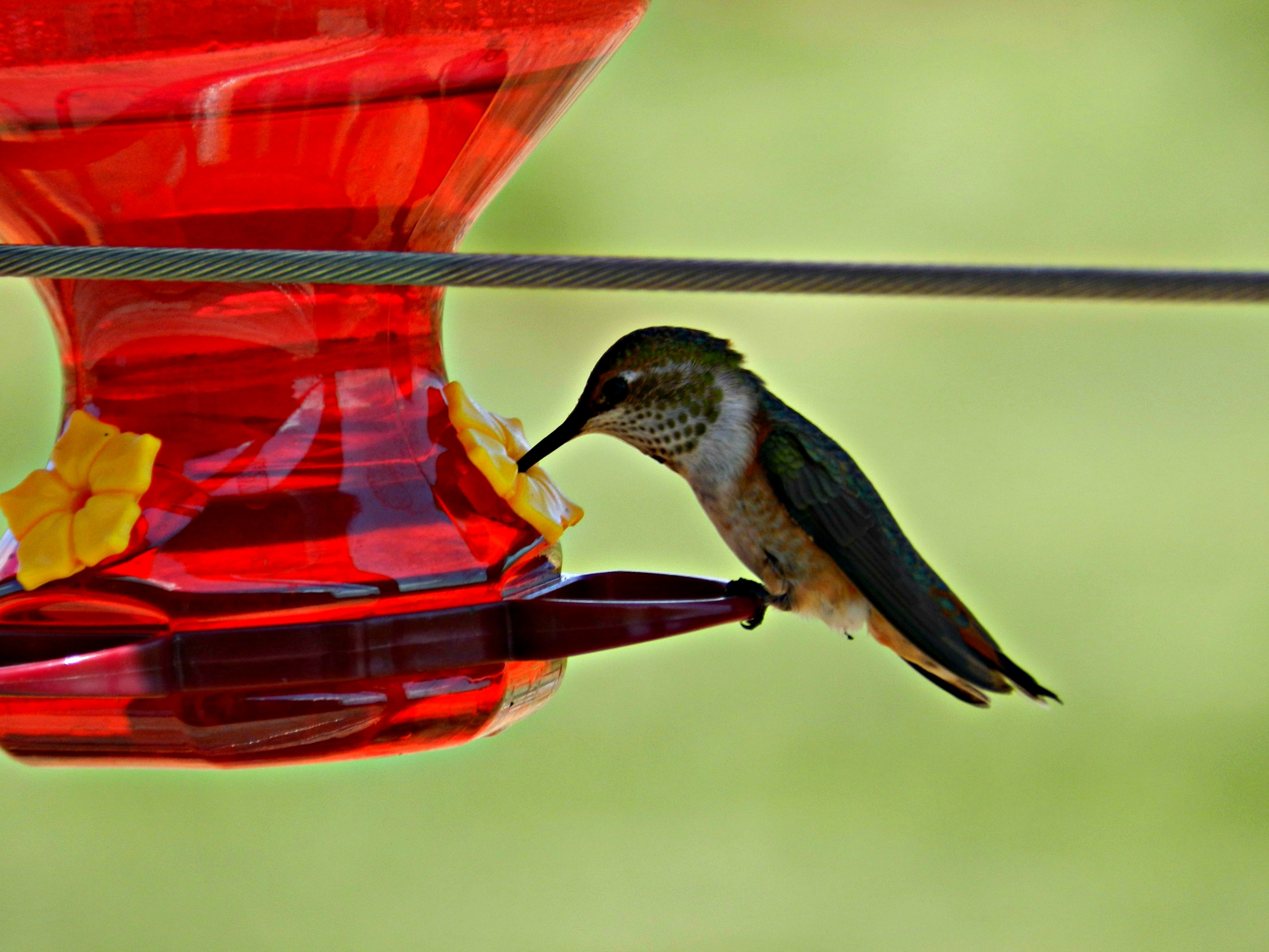 Finally, I heard the hoped for words. “Karen, you have a hummer!” I crept quietly to the kitchen window just as the tiny bird flashed away. Darn! A few hours later persistence paid off, and I caught the little guy sipping delicately from our red plastic blooms.