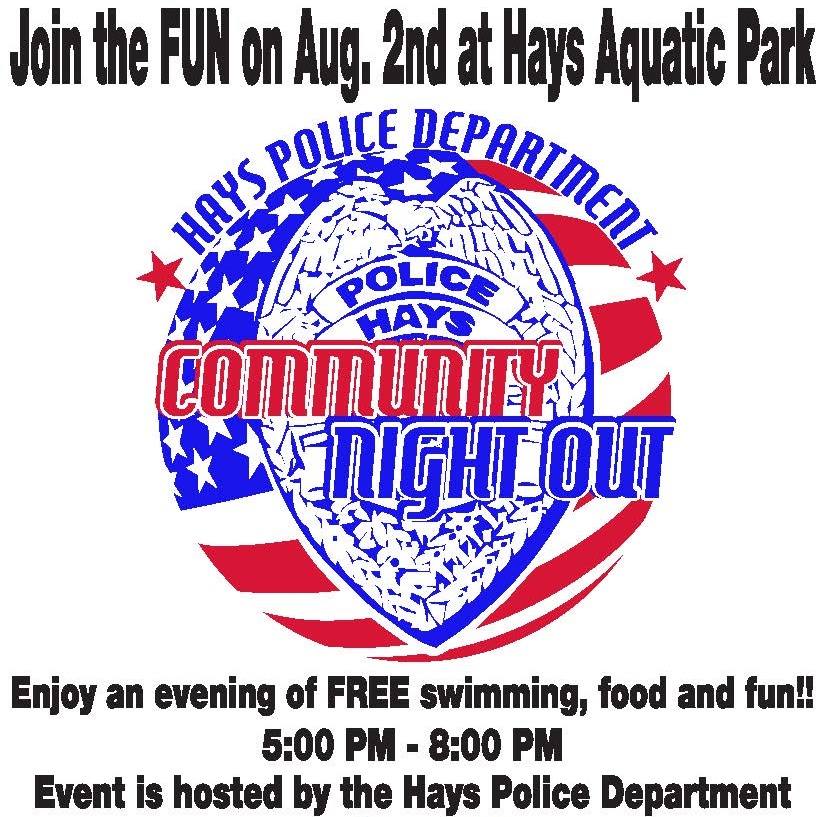 The Hays Police Department will host its 3rd Annual Community Night Out event on Thursday, August 2 from 5-8 p.m. at the Hays Aquatic Park, 300 Main.