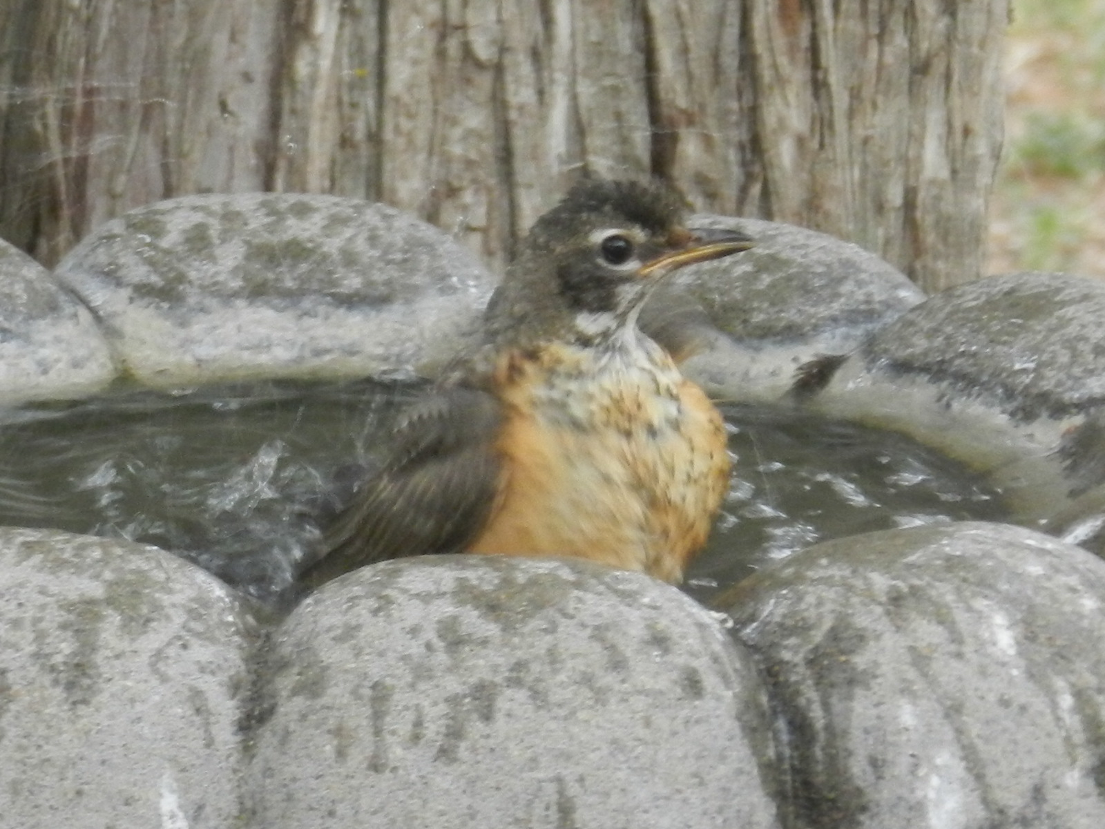Young robins with mottled coloring and spindly bodies remind me of 6th and 7th graders who’ve reached adult height but haven’t yet filled out. Their parents come to drink and groom circumspectly. Their offspring come to quench their thirst and end up splashing half the water out of the container.