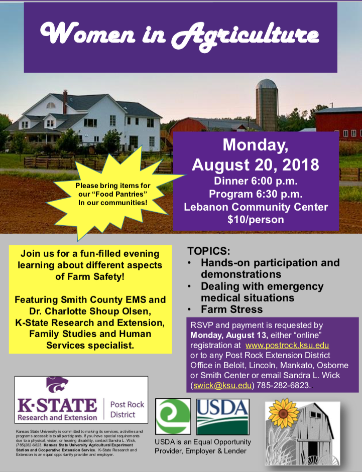 RSVP is requested by Monday, August 13 either online www.postrock.ksu.edu or the Post Rock Extension District, Smith Center Office at 785-282-6823. The event will include a full catered meal at a cost of $10 per person.