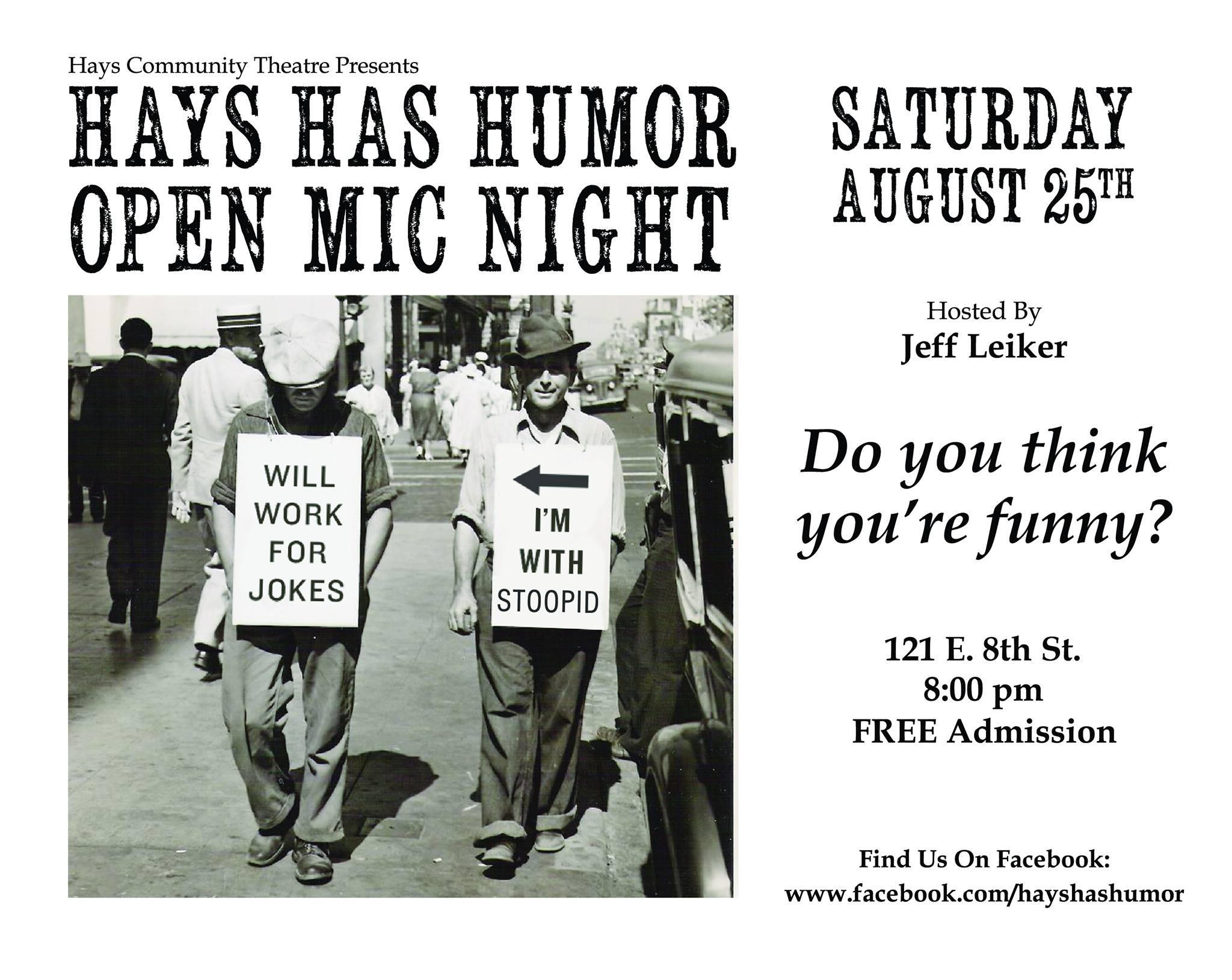 Once again Hays Has Humor brings you free, open mic, stand-up comedy. Be prepared for a fun night of belly laughs, chuckles, giggles, cackles, yuks, snickers, chortles and guffaws.