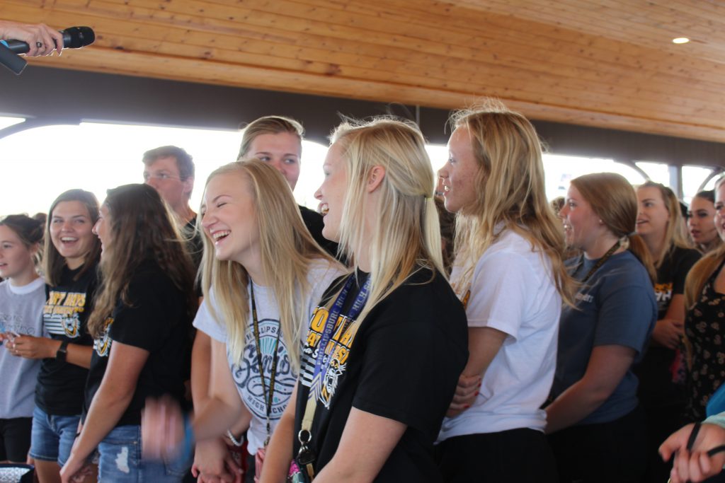 The leaders of the participating institutions and Hays Mayor James Meier lead the students in a spirited rally before they were treated to free food and chances to win a part of $3,000 in prizes donated by local businesses.