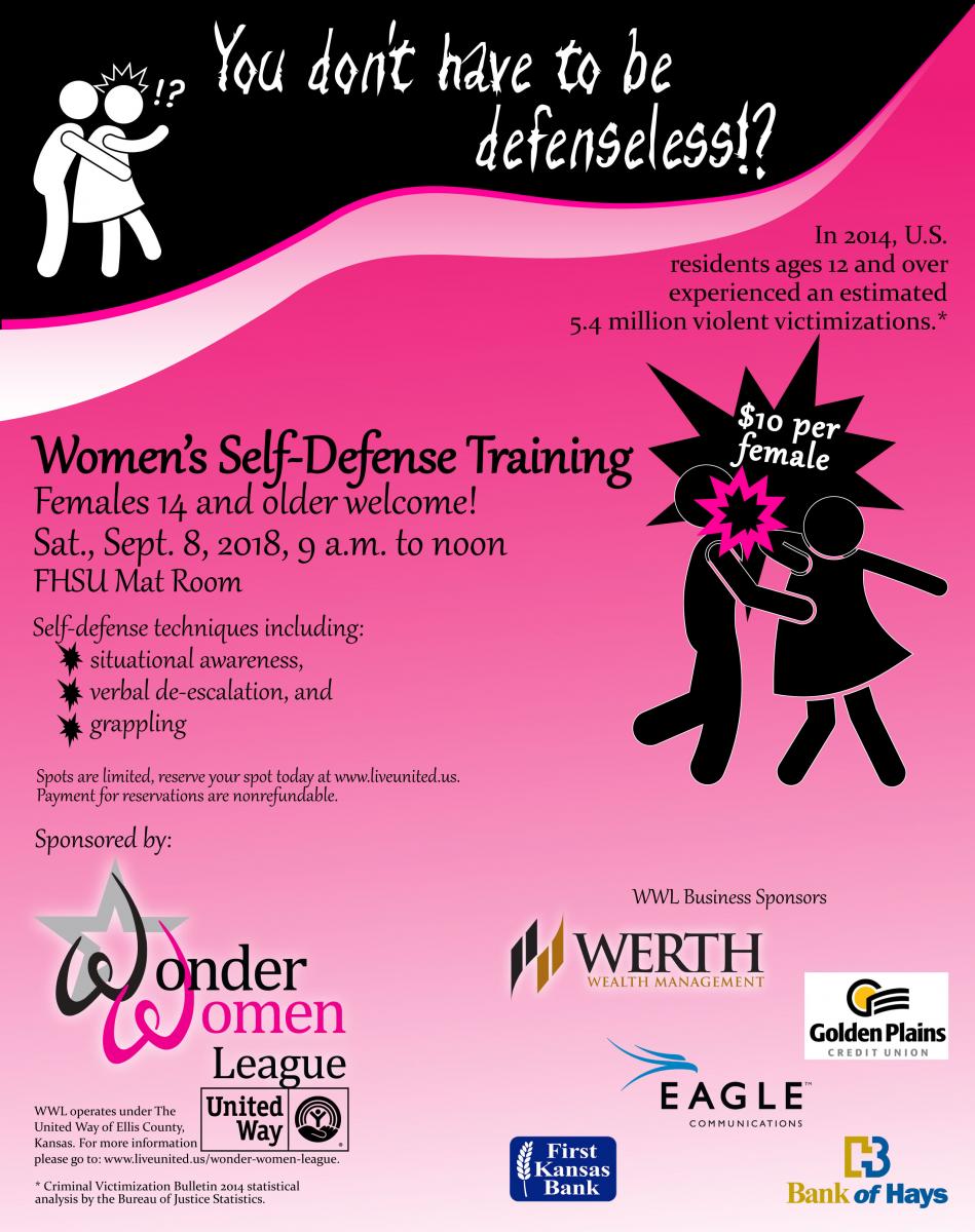 The Wonder Women League of the United Way of Ellis County is excited to offer a Women’s Self-Defense Training for females age 14 years and older. This will be held on Sat., September 8 from 9 a.m. to noon in the FHSU Mat Room in Cunningham Hall.