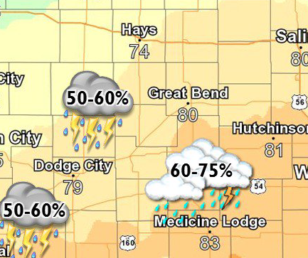 Thursday Night A 40 percent chance of showers and thunderstorms. Cloudy, with a low around 62. Northeast wind 6 to 8 mph.