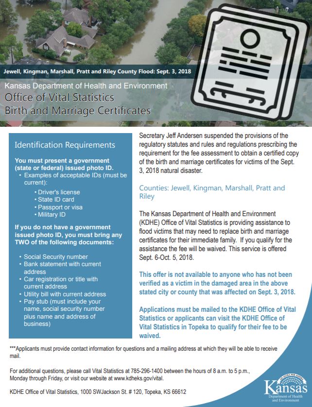 TOPEKA – The Kansas Department of Health and Environment (KDHE) is providing assistance to Sept. 3 flood victims and their immediate family members who may need to replace birth and marriage certificates damaged or destroyed by this event.