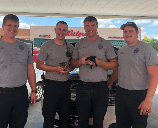 The firefighters stopped at a local fast-food restaurant and saved a kitten trapped in the engine compartment of a car.