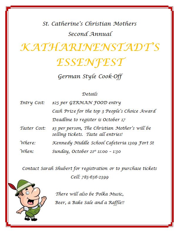 To enter as a contestant, contact Sarah Shubert at 785-656-2399 call or text message or email [email protected]. You can also get in contact with the Facebook event page – Katharinenstadt’s Essenfest.